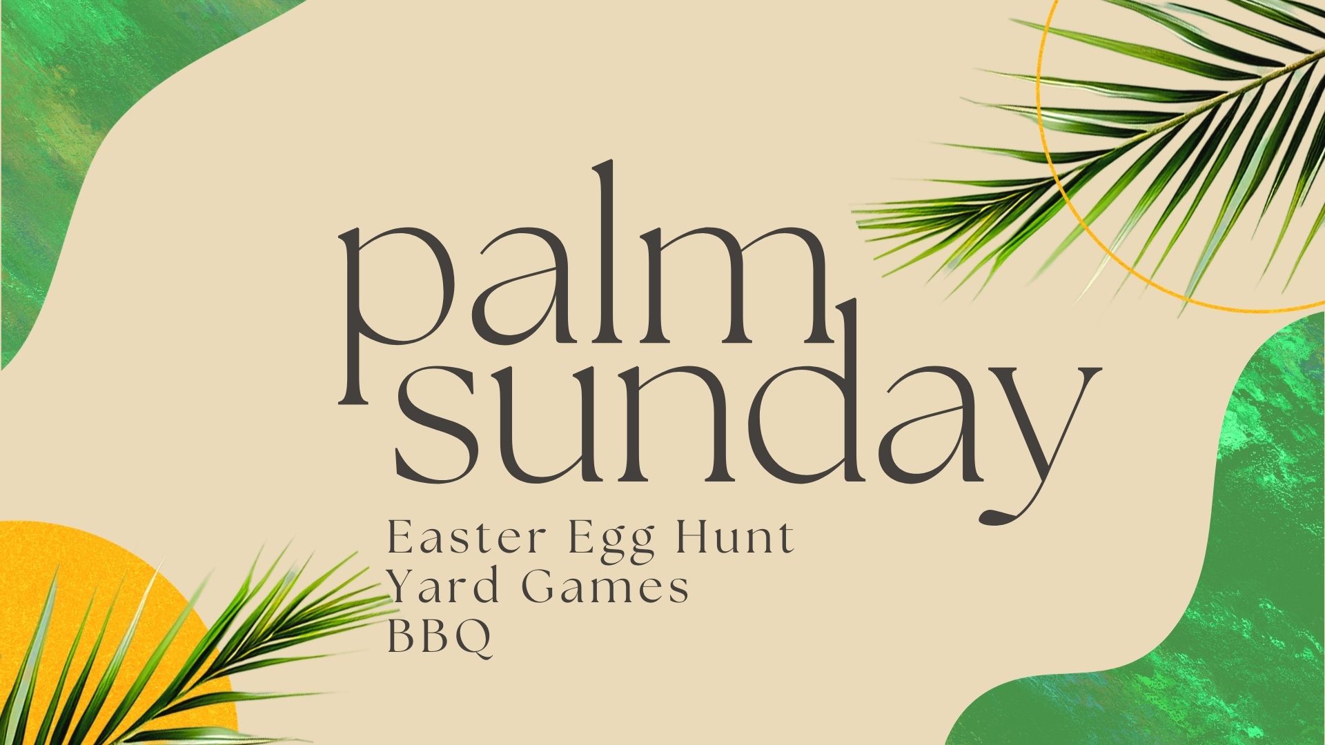 Join us for our annual Easter egg hunt and bbq! We will have a special Palm Sunday service at 10:30am, followed by an easter egg hunt, bbq lunch, and yard games immediately after service!