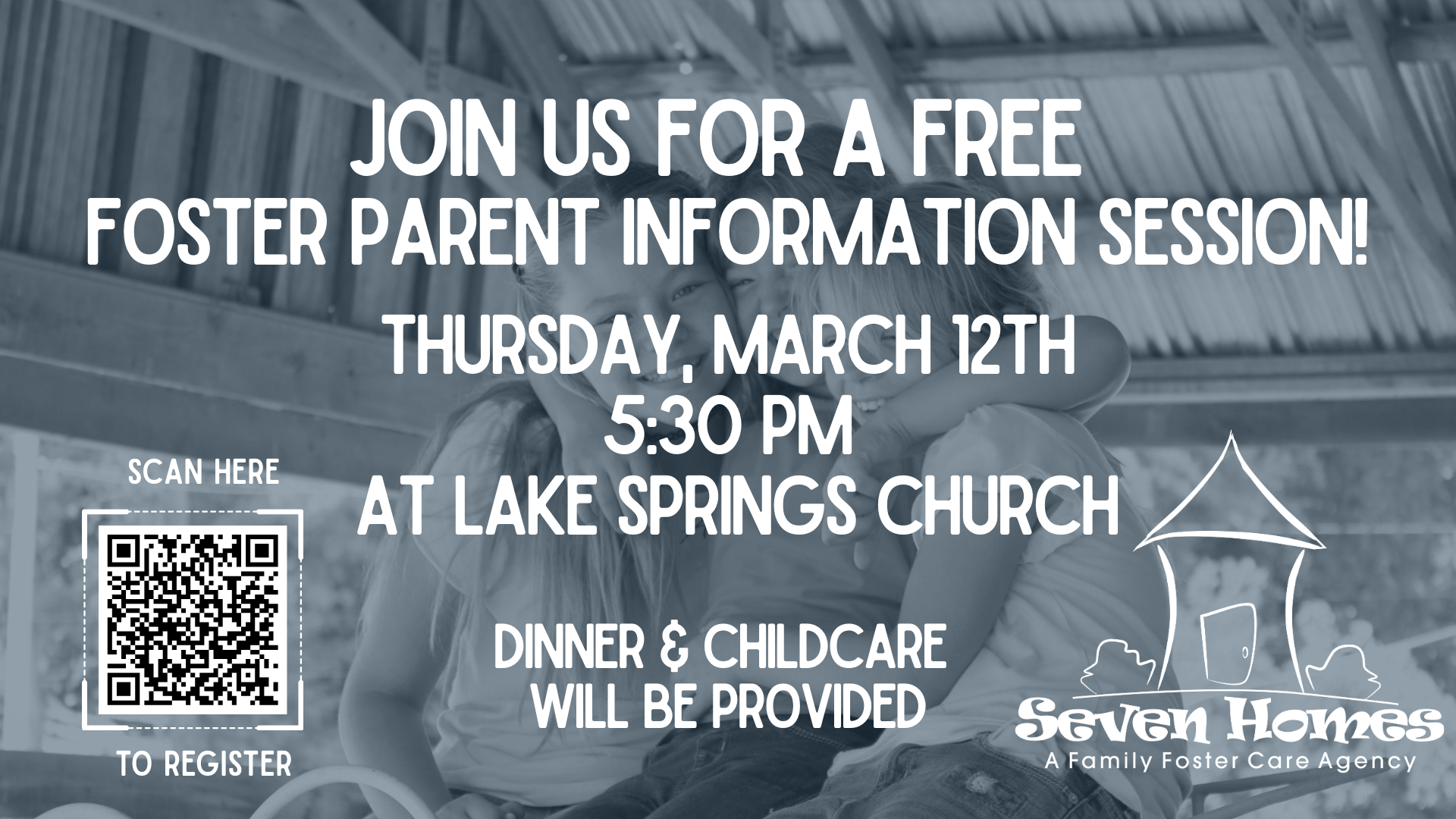 If you’ve ever thought about becoming a foster parent, we’d love for you to join us for a free foster parent information session, provided by Seven Homes Foster Care Agency. Dinner and childcare are provided, please register below.